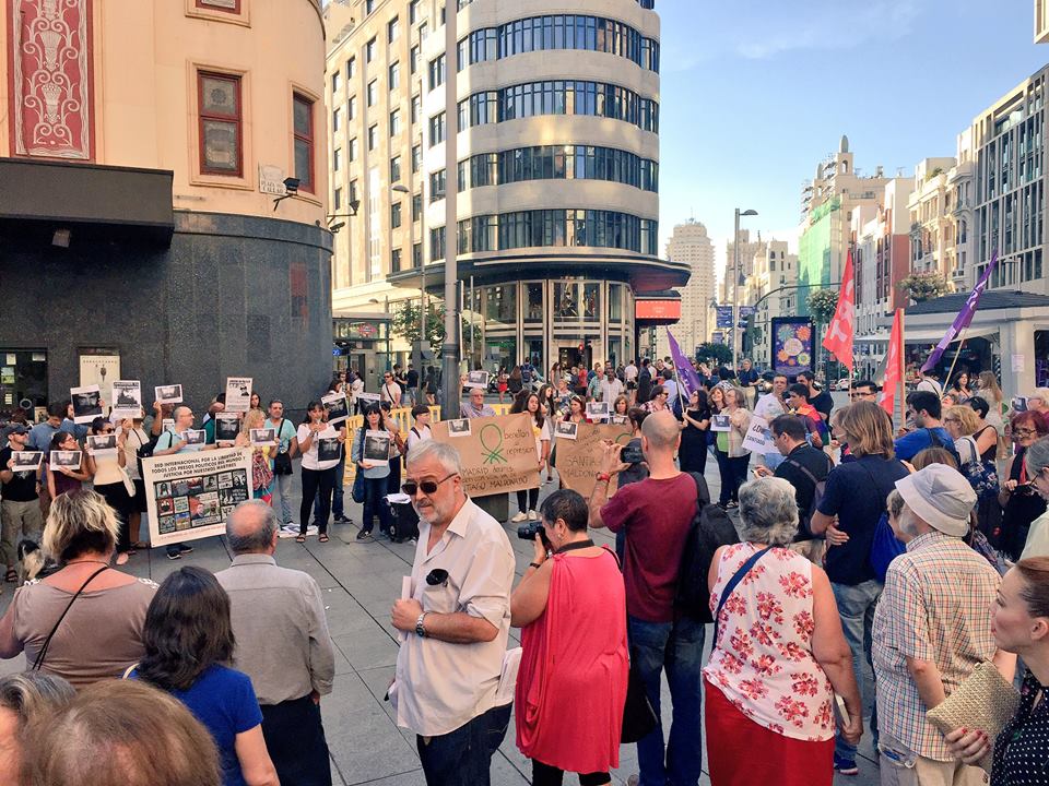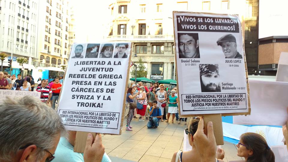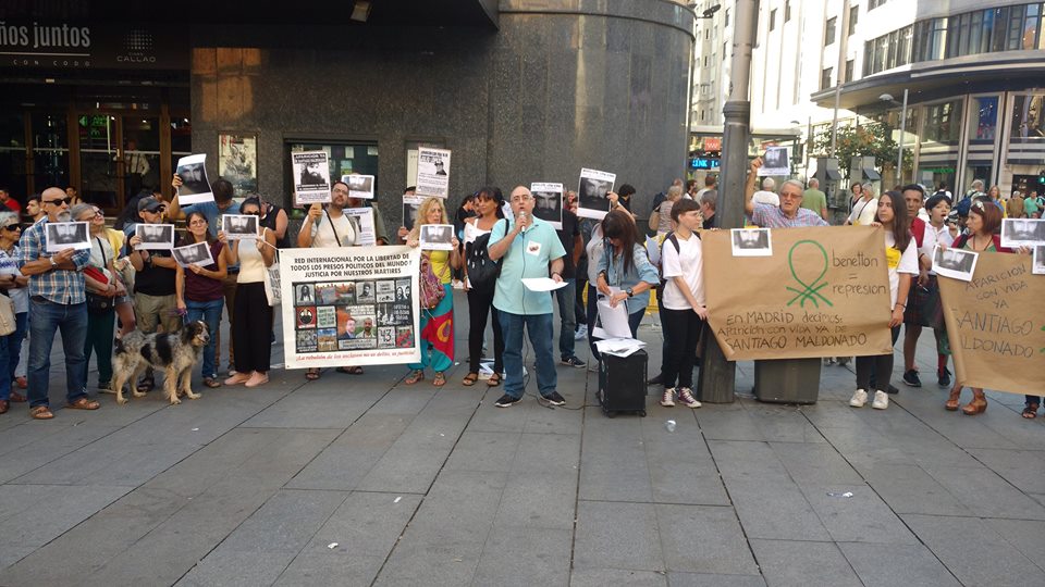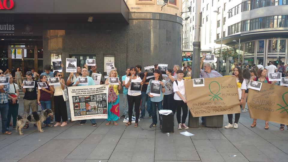 Hoy, a un mes y trece días de la desaparición de Santiago Maldonado, hemos realizado una concentración en Plaza Callao en Madrid para exigir su aparición con vida, haciendo responsable al estado de su desaparición forzada.