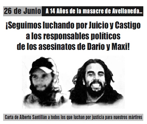 El próximo 26 de junio se cumplirán 14 años de la "Masacre de Avellaneda", donde la policía reprimió brutalmente una manifestación de trabajadores desocupados y organizaciones que luchaban por trabajo digno para todos. Con un despliegue enorme de la policía atacaron con palos, balas de plomo y de goma y gases lacrimógenos a miles de trabajadores, mujeres y niños que querían subir al Puente Pueyrredón a manifestarse.