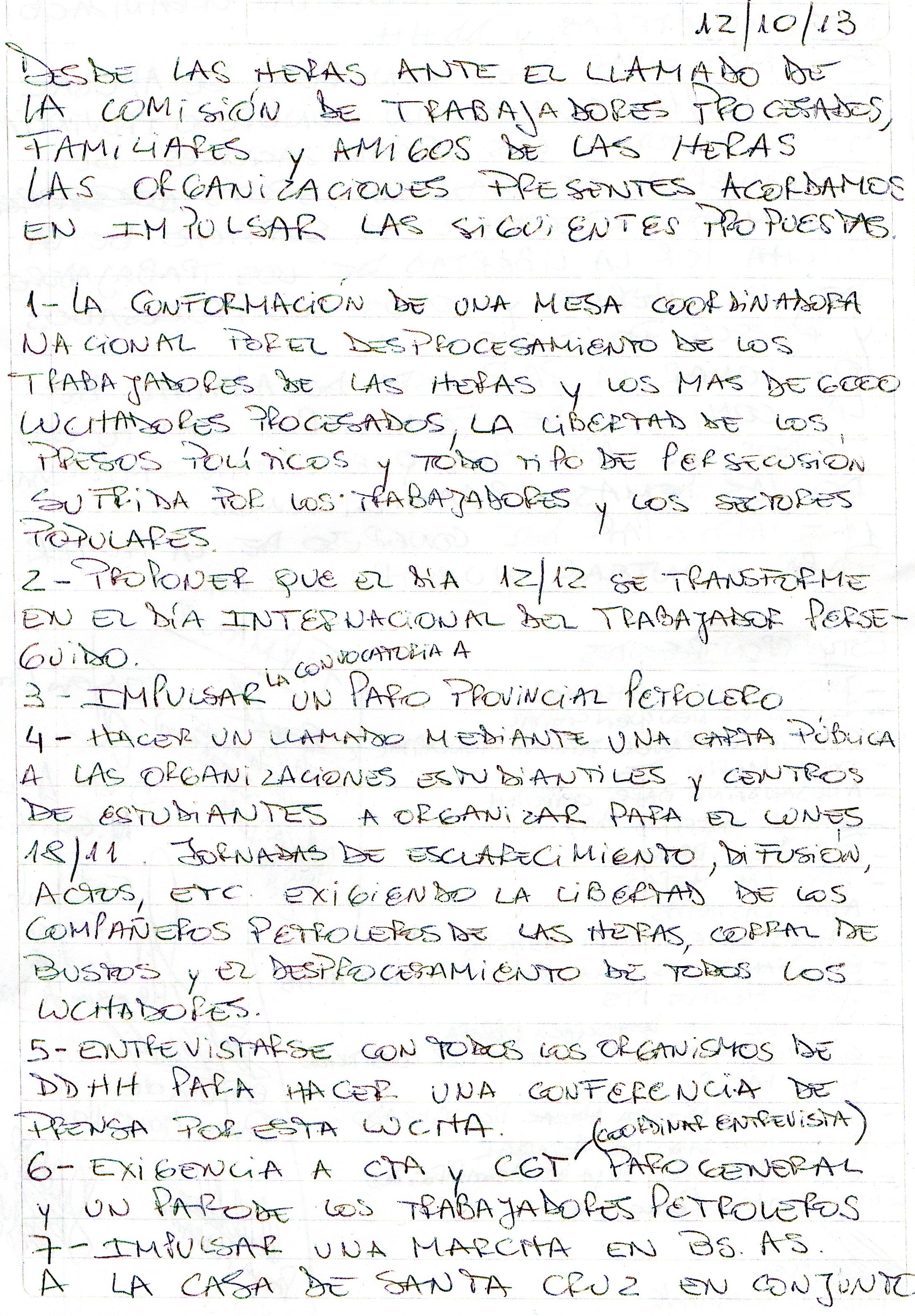 1- La conformación de una Mesa Coordinadora Nacional por el desprocesamiento de los trabajadores de Las Heras y los más de 6000 luchadores procesados, la libertad de los presos políticos y todo tipo de persecusión sufrida por los trabajadores y los sectores populares.
