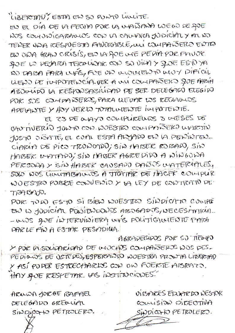 El 23 de mayo cumpliremos 3 meses de cautiverio junto con nuestro compañero Martin Justo Oñate, el cual alejado en la penitenciaría de Pico Truncado, sin haber robado, sin haber matado, si haber agredido a ninguna persona y sin haber causado daños materiales, solo nos limitábamos a tratar de hacer cumplir nuestro pobre convenio y la ley de contrato de trabajo.