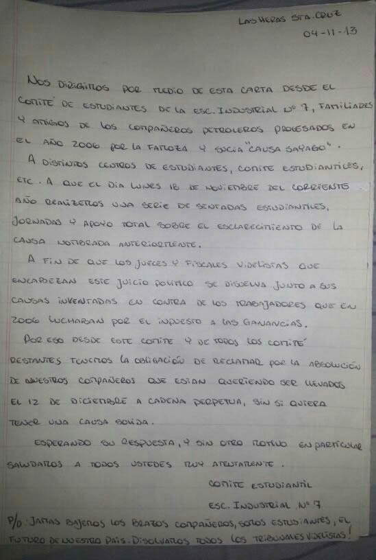 Nos dirigimos por medio de esta carta desde el Comité de Estudiantes de la escuela industrial N˚7, familiares y amigos de los compañeros petroleros procesados el año 2006 por la famosa y sucia “causa Sayago”. A distintos centros de estudiantes, comité estudiantiles etc. a que el día lunes 18 de noviembre del correspondiente año realizaremos una serie de sentadas estudiantiles, jornadas y apoyo total sobre el esclarecimiento de la causa nombrada anteriormente.