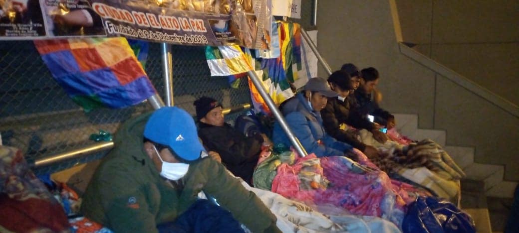 Apostados en las puertas de la lujosa Casa Grande del Pueblo del gobierno esperan a que sean recibidos por representantes del Estado en medio de lluvias y frío con frazadas, cartones y náilones. El gobierno de Arce les ha cerrado las puertas a las víctimas de la masacre de 2019 después de arengar prioridad por la “justicia”, sin embargo los asesinos como Murillo, Camacho, Mesa, Árias siguen gozando de su libertad después de haber masacrado en Senkata y Sacaba con la tutela de la OEA y la ONU.