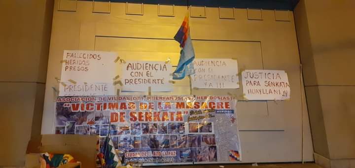 De esta manera, los heridos y las madres que perdieron a sus hijos asesinados por el fascismo o torturados y apresados por la policía camachista, se extraían sangre para escribir sus reclamos en distintos carteles con la consigna de ¡Senkata y Sacaba de pie, nunca de rodillas! Ya llegada la noche decidieron realizar una vigilia durmiendo en la intemperie, cubriéndose con lo que podían, mientras venían con el estómago vacío en toda esa jornada de lucha.