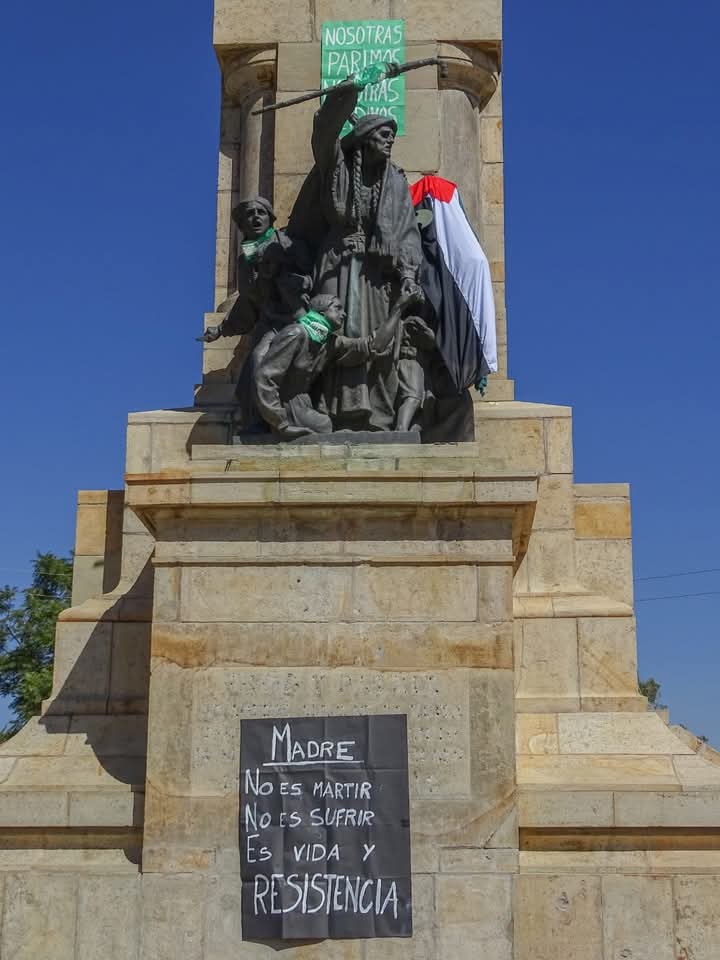 En Palestina, como todas sabemos, ha ocurrido un genocidio que ha trastocado profundamente la vida de miles de mujeres. El 28 de mayo pasado, dos compañeras cochabambinas decidieron manifestar públicamente su rechazo a la injusta guerra de devastación que ha destruido esa región colocando, en la estatua de las Heroínas de Cochabamba, banderas palestinas, pañuelos verdes y cartulinas con mensajes de repudio a la destrucción de la vida en aquel país.