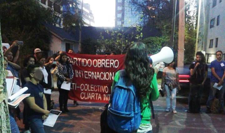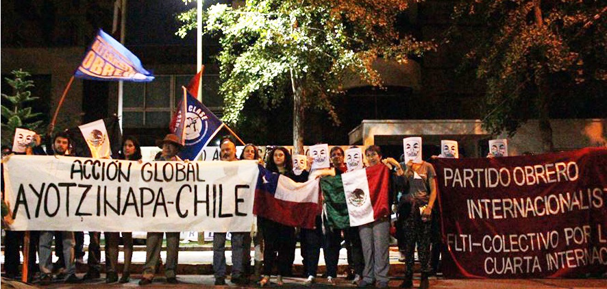 Una nueva jornada internacional de lucha ha sido llamada este jueves 26 por la aparición con vida de los 43 estudiantes normalistas de Ayotzinapa. Desde el POI-CI nos hicimos presentes en esta nueva acción internacionalista de los explotados mexicanos, denunciando el plan del gobierno de Peña Nieto y el régimen del fraude del PRI, el PAN y el PRD que con su policía, ejército y bandas paramilitares ha hecho desaparecer a los 43 estudiantes de Ayotzinapa y ya ha masacrado a más de 70.000 obreros y explotados para terminar de convertir a México en una enorme maquila al servicio de las transnacionales imperialistas, y que no hará más que profundizar su represión para imponer los planes del Pacto del Transpacífico comandado por Obama y los piratas de Wall Street; los mismos planes que viene a imponer el gobierno de Bachelet con la estafa de sus “reformas”. En este sentido, la voz de los compañeros de Las Heras también se hizo presente, y leímos su moción de lucha internacionalista para que tanto el 24 de marzo –en alusión al golpe militar de Argentina- como este 26 realizar una jornada nacional de lucha para poner en pie una Red de Solidaridad Internacional por la libertad de todos los presos políticos de Palestina, de Argentina, de la juventud griega, de los combatientes internacionalistas que fueron a luchar junto a los mineros ucranianos del Donbass y de todo el mundo, y por el juicio y castigo para todos los mártires de la clase obrera. Así, sorteando las barreras de las fronteras nacionales, un curso de lucha internacional empieza a ponerse de pie y merece desarrollarse. El acto culminó gritando ¡Que se vayan todos y no quede ni uno solo! ¡Vivos se los llevaron, vivos los queremos! Y nombrando a los cada uno de los 43 compañeros desaparecidos, respondiendo un enérgico ¡Presente! Corresponsal de “El Cordonazo”