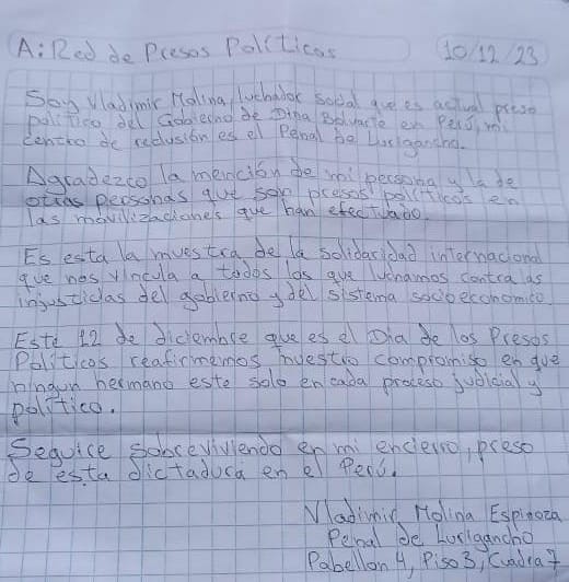 LETTER FROM COMRADE VLADIMIR MOLINA, IN JAIL AS A POLITICAL PRISONER FOR FIGHTING AGAINST THE DICTATORSHIP OF DINA BOLUARTE