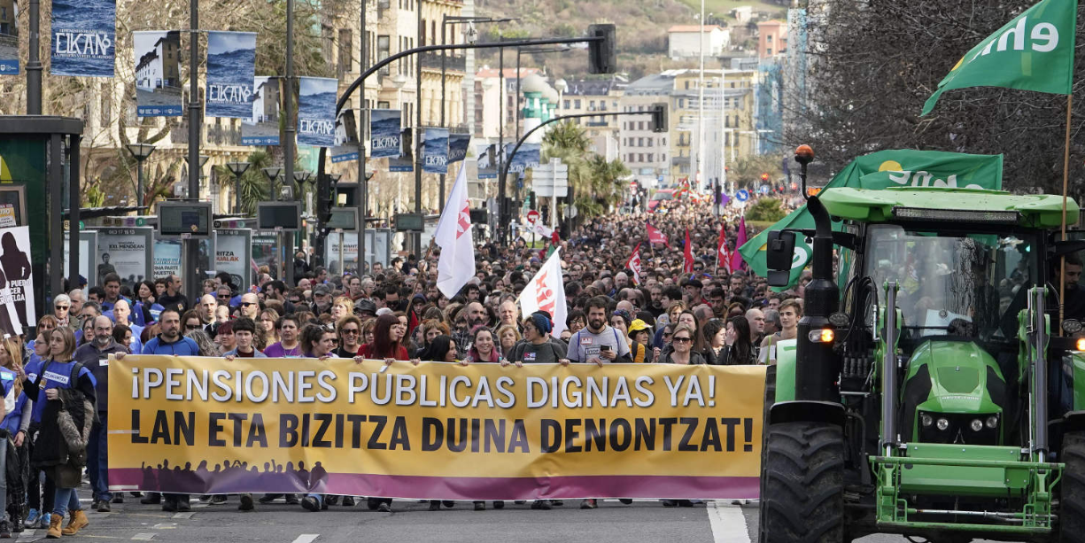 Unidas Podemos, que traicionó ayer el movimiento de los indignados, que después entregó la lucha independentista del pueblo catalán, hoy actúa como esquirol de la huelga de EuskalHerria para seguir sosteniendo a la monarquía y su gobierno del que es parte. Un gobierno dirigido por el PSOE que participó junto al PP y todos los partidos patronales, del Pacto de Toledo. Un pacto ideado para romper el modelo público de pensiones para que no estuviesen basadas en un salario diferido que tuviera como garantía la aplicación del IPC para su revalorización. El Pacto de Toledo simplificó el sistema para que el estado no fuese el responsable de garantizar los derechos de toda la población y la capacidad del mismo para solucionarlo, dando protagonismo a los planes de pensiones privados e individuales. El PSOE fue también quien comenzó el ataque a las pensiones con Zapatero en 2011 retrasando la edad de jubilación a los 67 años y ampliando el período de cálculo para la base reguladora.