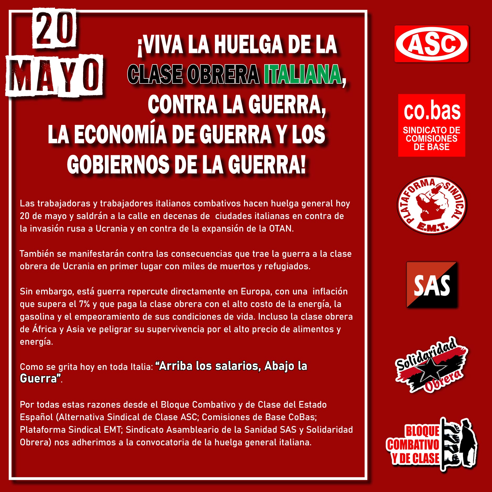 Desde Democracia Obrera del Estado Español y Avanzada Proletaria de Italia hemos hecho un llamamiento a todas las organizaciones obreras europeas para que hagan suya la moción de los trabajadores italianos, para que la huelga del 20 de mayo sea un primer paso hacia una huelga general en toda Europa, por lo que seguimos apelando a la clase obrera europea para detener esta guerra que solo sirve para dividir a Ucrania. Los generales verdugos de Putin y los asesinos de la OTAN deben ser detenidos.