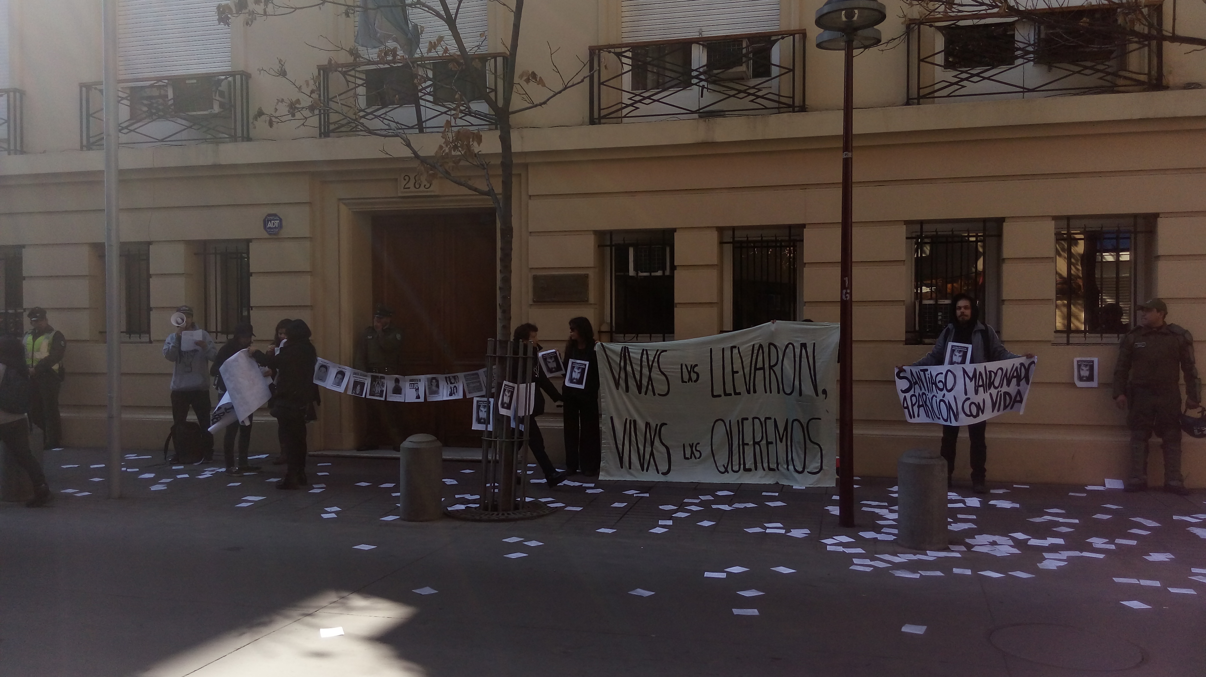 Nous commençons à concentrer près de 12 30 dans la banlieue de l’ambassade, laquelle a été entourée et gardée par une forte contingente policière. Une décennie d’activistes au cri de « vivant Il a été enlevé, vivant nous le voulons de retour ! » nous exigions la réapparition en vie du camarade et nous dénoncions les cas de disparition des 43 étudiantes normalistes d’Ayotzinapa (Mexique), les disparus pendant la dictature, etc. nous faisions sentir notre mécontentement contre cette démocratie pour les riches.