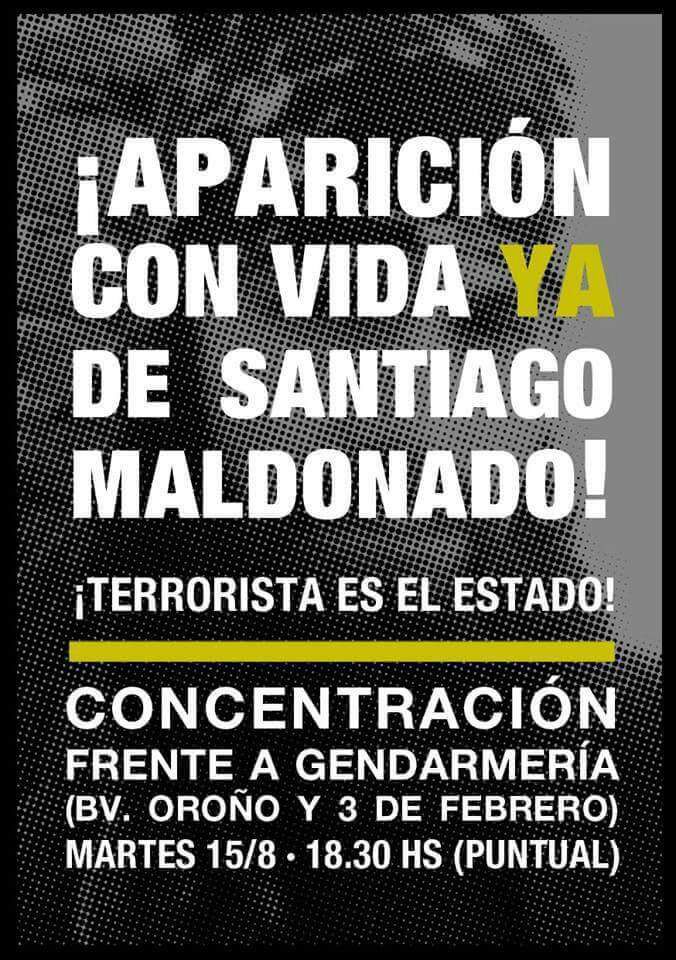 POUR L’IMMÉDIATE RÉAPPARITION EN VIE DE SANTIAGO MALDONADO L’ÉTAT EST LE TERRORISTE ! MEETING FACE À LA GENDARMÉRIE ROSARIO, ARGENTINE (BV OROÑO ET 3 DE FEBRERO) MARDI 15/8- 18 HEURES