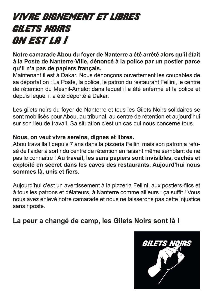 Comme ils l’expriment sur le tract que nous reproduisons, Abou a été dénoncé par un postier de la Poste de Nanterre et immédiatement déporté. Au cri de : "S’ils s’attaquent à l’un entre nous, les gilets noirs seront tous là!" se sont mobilisés ce 19 septembre contre l’état raciste de la Ve République française et contre ses complices, contre la déportation d’Abou.