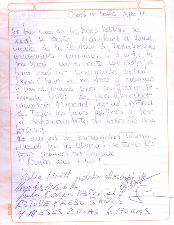 "... convocamos a las organizaciones obreras y estudiantiles a nivel nacional e internacional a que junto a los comuneros de Ayo Ayo mocionemos que hay que fortalecer una RED DE SOLIDARIDAD INTERNACIONAL POR LA LIBERTAD DE TODOS LOS PRESOS POLÍTICOS DEL MUNDO..."