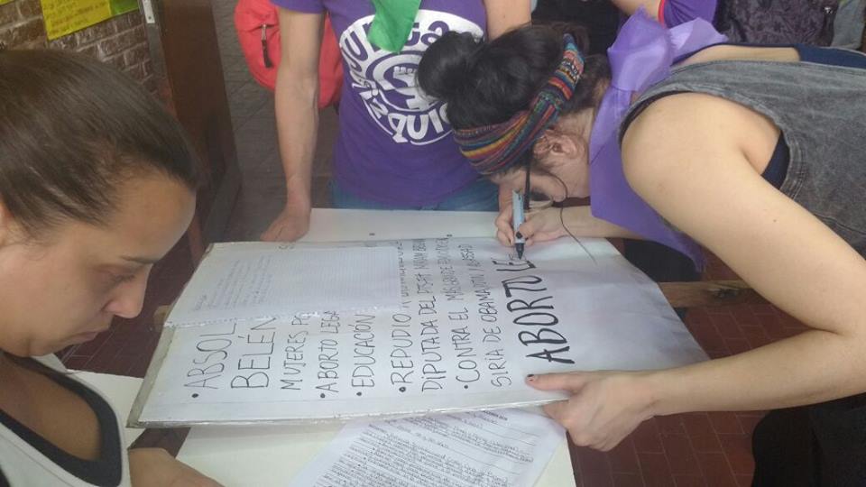 Desde “Paso a la Mujer Trabajadora” planteamos “la necesidad de pelear x la absolución de Belén, por el aborto legal, seguro y gratuito dejando claro que las que padecen con la ilegalidad del aborto somos las mujeres explotadas ya que las patronas tienen sus problemas resueltos, ninguna muere por abortar ellas lo hacen en las mejores clínicas y sin que nadie las persiga por ello. (…) Como bien dicen las compañeras que han intervenido en este taller: el capitalismo es el responsable, Obama - Putin y Al Assad son los más grande femicidas del mundo con 600 mil asesinados, 320.000 mujeres asesinadas en cinco años de masacre en Siria, donde hay una guerra de exterminio contra los trabajadores que osaron levantarse por el pan en una revolución, son justamente las mujeres que rompen el cerco en Alepo en lucha con sus hijos, los niños queman gomas para que los aviones no los intercepten con sus bombas de racimo en vez de estar jugando con sus madres, ellos lo que piden es tener una vida digna, se están enfrentando a Obama Putin y Al Assad. Llamo a que nos pronunciemos por ellas…” |
