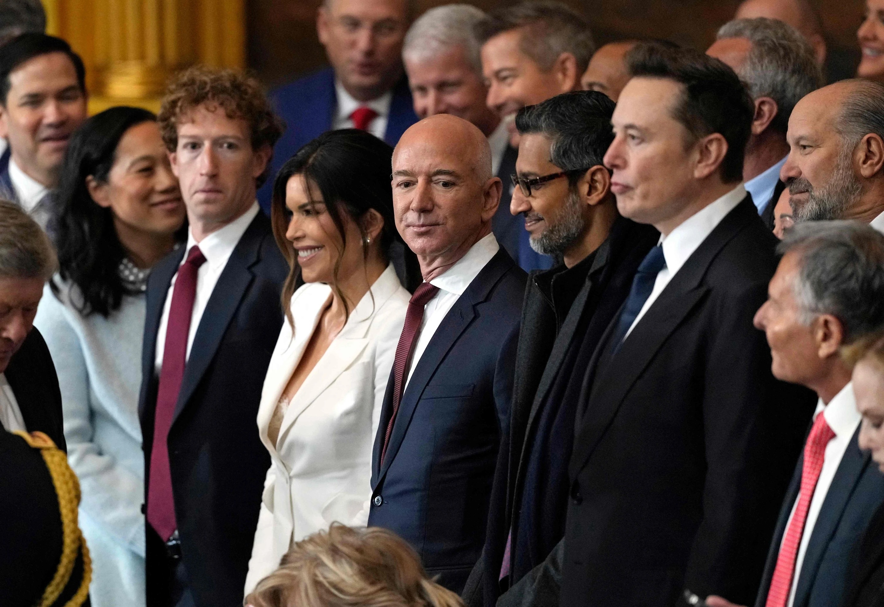 5) Cuando asumió nuevamente como presidente de EEUU, Trump estuvo rodeado por los más grandes magnates de las industrias tecnológicas y de los enormes fondos de gestión de negocios de Wall Street: BlackRock, Vanguard y State Street. Estos estuvieron representados por Elon Musk, Mark Zuckerberg de Facebook/Meta, Sundar Pichai de Google, Tim Cook de Apple, etc.