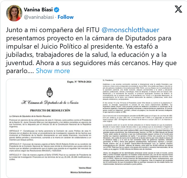 Post de Del Caño sobre seu projeto de "interpelação a Milei"