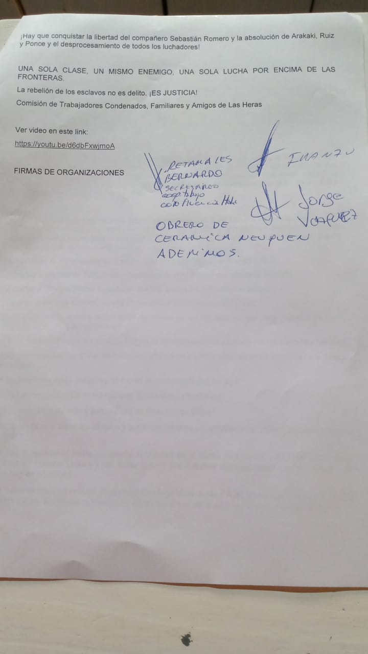 Adhesión a la campaña por la absolución a los petroleros de las Heras y la libertad de los presos políticos del mundo.
