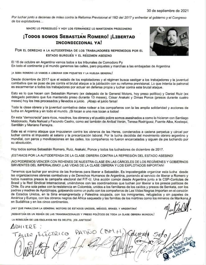 Desde el distrito minero de Huanuni, adhesión del Taller Eléctrico Patiño de la Empresa Minera Huanuni a la lucha por la libertad de Sebastián Romero