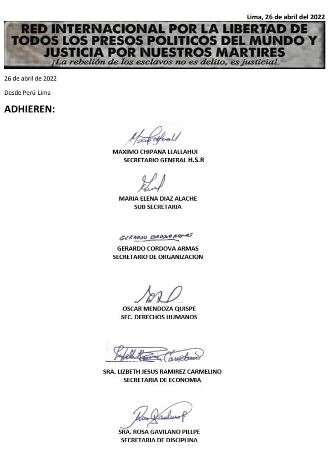 Desde el Hospital Santa Rosa en Lima-Perú se solidarizan y adhieren a la demanda de Libertad a los presos políticos del levantamiento por el hambre del 11J