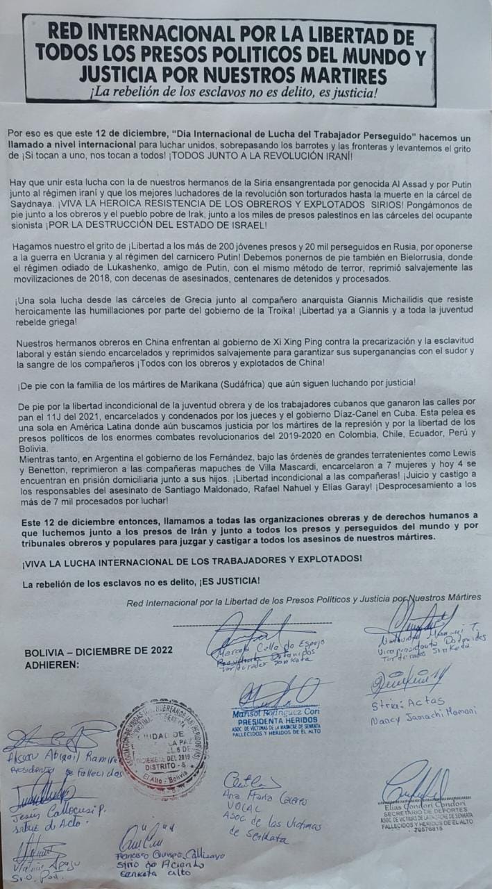 La Asociación de Víctimas de la Masacre de Senkata, Fallecidos - Heridos - Privados de Libertad, que aun continúan peleando por justicia luego de la masacre del 2019 y la libertad pura y simple, se adhieren a la jornada de lucha del 12 de diciembre por el día internacional de los trabajadores perseguidos