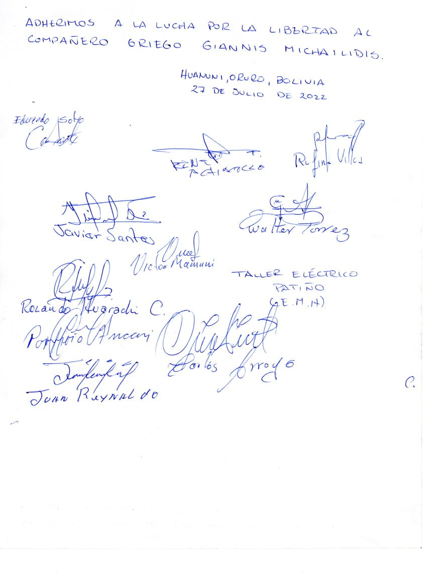 Desde diferentes organizaciones combativas, colectivos independientes y sindicales de Bolivia hacemos llegar nuestra solidaridad y reclamamos por la libertad inmediata e incondicional al preso anarquista Giannis Michailidis y de todos los presos políticos de Grecia, además exigimos las garantías en su salud con profesionales idóneos que deseen ellos para su atención médica.