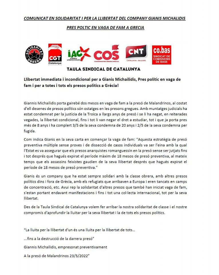 Comunicado de lucha por la libertad del compañero Giannis Michailidis por parte de la Mesa Sindical de Catalunya.