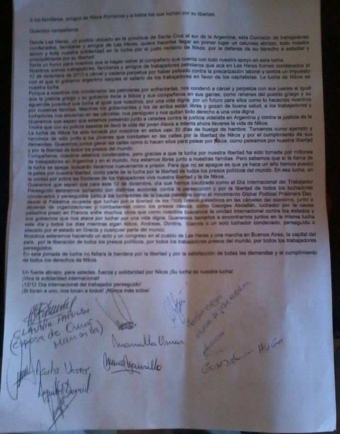 Desde Las Heras, un pueblo ubicado en la provincia de Santa Cruz al sur de la Argentina, esta Comisión de trabajadores condenados, familiares y amigos de Las Heras, quiere hacerles llegar en primer lugar un caluroso abrazo, todo nuestro apoyo y toda nuestra solidaridad en la lucha por el justo reclamo de Nikos, por la defensa de su derecho a estudiar y principalmente por su libertad.
