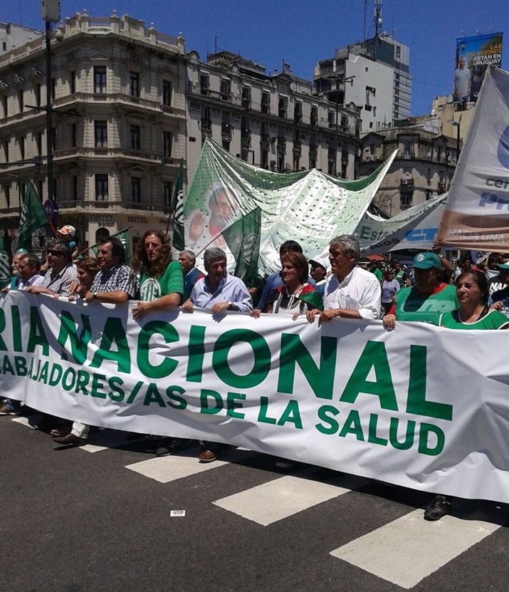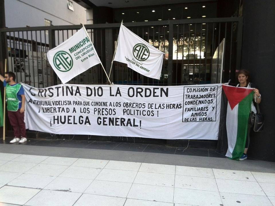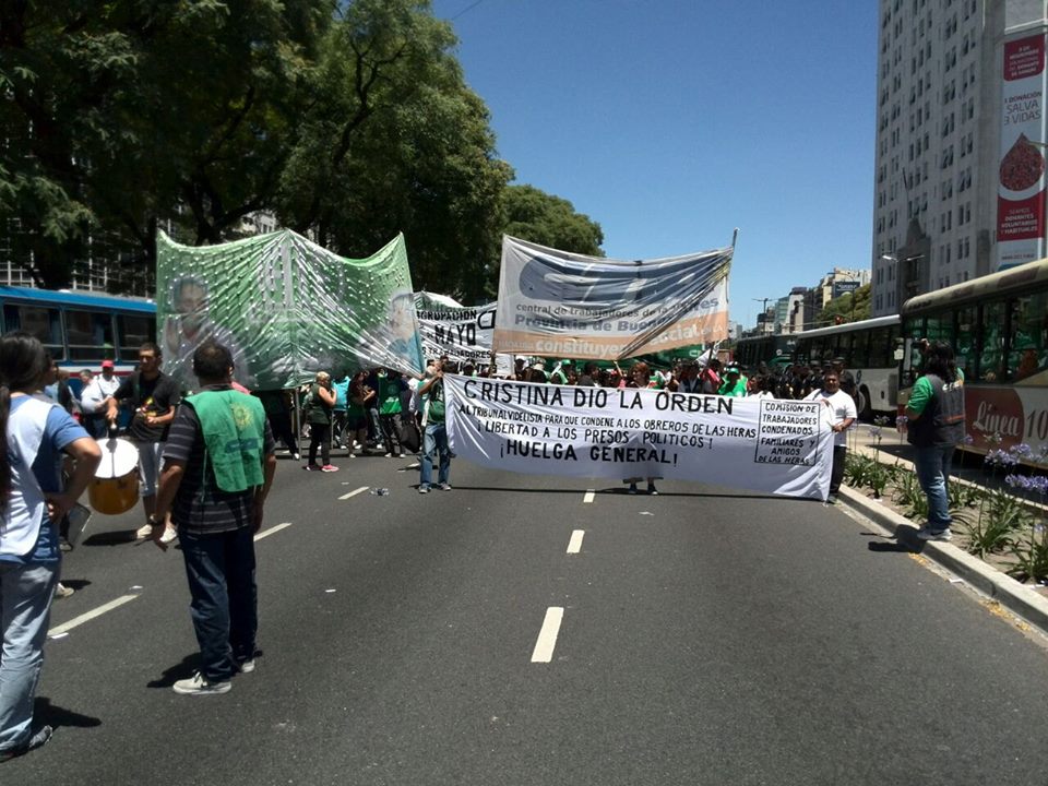 Los compañeros de la Comisión de Trabajadores Condenados, Familiares y Amigos de Las Heras peleando junto a los trabajadores estatales de ATE en su paro nacional