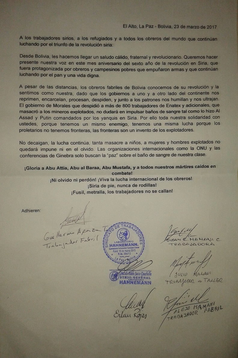 Compañeros no están solos, su lucha es la nuestra porque los gobiernos de Latinoamérica como el Evo Morales en Bolivia no dudarán de regar las calles con más sangre obrera y campesina como ejemplo del perro genocida de Bashar Al Assad. Sólo uniéndonos podremos lograr el derrocamiento de los gobiernos asesinos de obreros y campesinos, lacayos de las transnacionales imperialistas.
