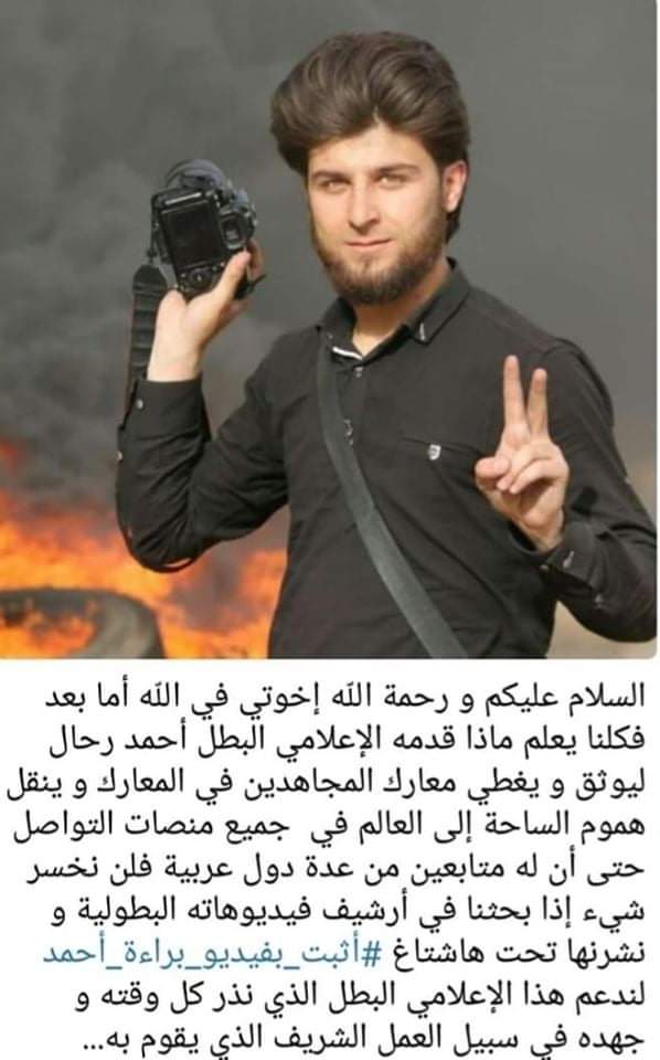 Este valeroso joven, con su carisma, su bondad, su valentía y la convicción de que no hay otra forma de ganar la revolución que no sea con la caída del régimen basharista y todos sus aliados, se sumó en el 2016 a nuestro grupo de colaboradores y corresponsales en Siria. Ahmed no titubeó a la hora de solidarizarse con los socialistas que luchamos junto a las masas sirias en todo el mundo para que su revolución sea triunfante pues vemos en ella lo más avanzado de la clase obrera y entendemos que defendiendo al pueblo pobre sirio hasta el final, es la mejor manera de ponerle un freno a los dueños de este sistema hambreador que vendrá a por todos nosotros a sumergirnos en escenarios iguales o peores a los de Siria, si es que sus negocios así lo requieran.