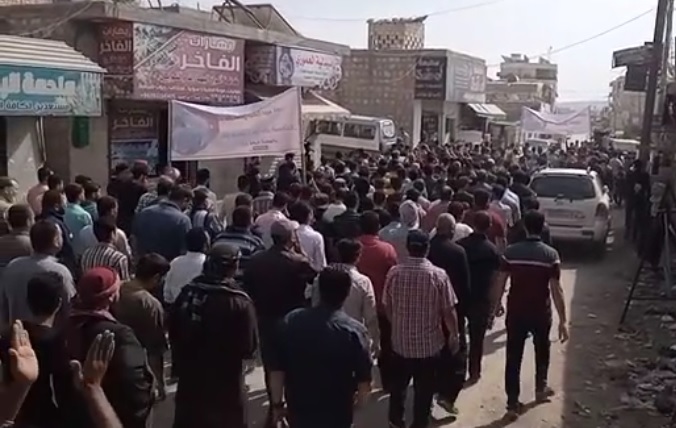 Esta es una marcha contra Turquía y sus sirvientes del ESL y de HTS que buscan avanzar en la reconciliación con Al Assad sobre la sangre de los mártires de la revolución siria. La resistencia siria marcha porque no va a entregar a sus mártires ni a sus presos; por volver a sus ciudades recuperar sus hogares y contra el plan de campamentos de esclavos donde los quiere recluir Turquía en una franja de Siria.