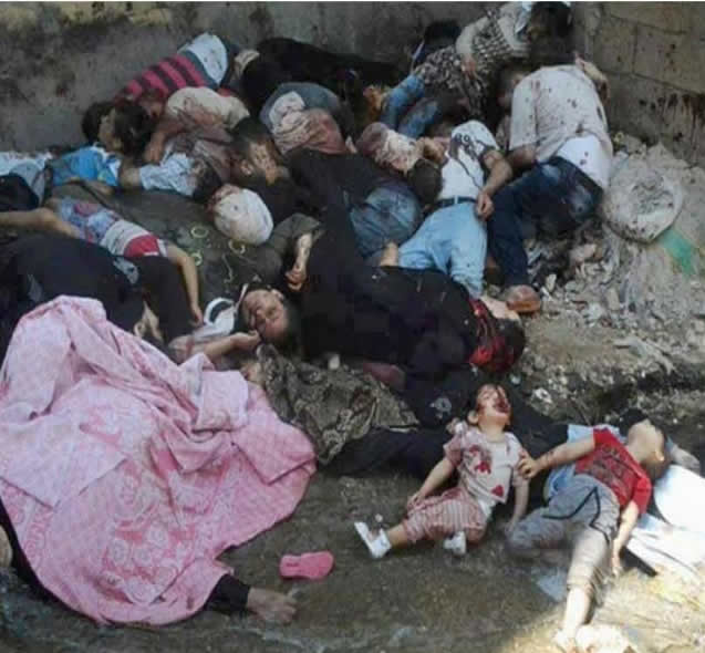 En realidad la contrarrevolución se fortalece cuando, con la pistola en la cabeza de los bombardeos y masacres de la aviación y el ejercito de Al Assad, se impone el ingreso de ESL y de la burguesía sunita iraquí para desarmar a las masas aterrorizadas. Al Assad impuso el genocidio con el apoyo del imperialismo y con las manos libres que le dejó la izquierda traidora del FSM, que le dio la espalda a la clase obrera siria para que fuera manipulada por todas las fracciones burguesas que fueron a intervenir en la revolución para estrangularla.