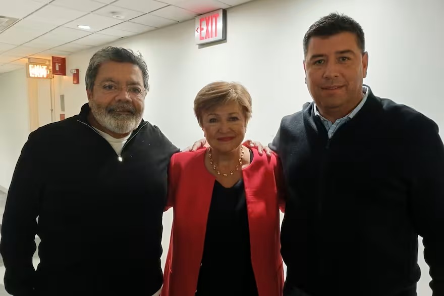 Gerardo Martínez y Cristian Jerónimo de la CGT en Washington junto Kristalina Georgieva, la jefa del F