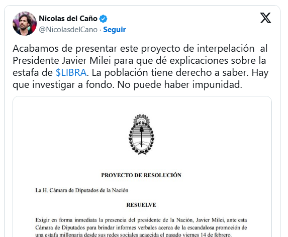 Post by Del Caño on his project of "interpellation of Milei"