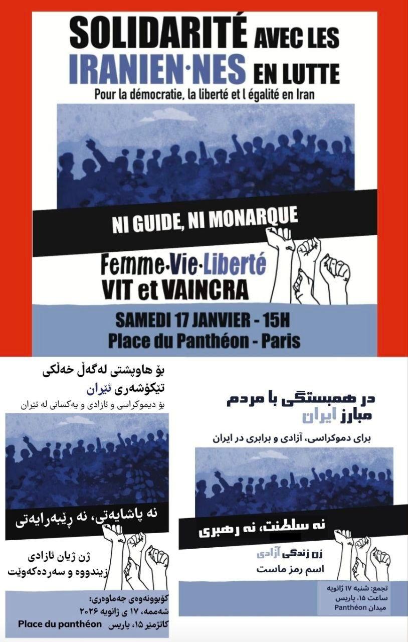 Au début et à la fin du cortège, des représentants d’associations de défense des droits humains, des organisations féministes et des syndicats ont pris la parole. Ils ont dénoncé les crimes du régime iranien, affirmé l’indépendance du mouvement populaire iranien, rejetant toute alternative autoritaire venue d’en haut, et réaffirmant leur engagement en faveur de la démocratie, de la liberté et de l’égalité.
