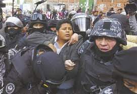 Tan solo en los últimos meses junto a la patronal está “negociando” una ley laboral totalmente esclavista (Código de Trabajo) que no es más que la flexibilización laboral dictada por el G-20 y Wall Street; los campesinos pobres de los Yungas desde principios de año vienen enfrentando a la policía del gobierno y su política de arrancarles tierras de producción de coca, ya murieron tres cultivadores asesinados y el hijo de uno de los dirigentes, y se pretende encarcelar a su dirigente principal, Franklin Gutiérrez, por 30 años; la flexibilización laboral y quite de conquistas llega a distintas minas de Potosí y La Paz mientras Huanuni continúa militarizada en vía de que se privatice con el intento de refundación de la Corporación Minera de Bolivia (COMIBOL); buscan imponer la Ley 2027 del Estatuto de Funcionario Público que cercena los derechos conquistados y beneficios de trabajadores asalariados; la policía asesina, autoridades del gobierno y YPFB, a cuenta de la petrolera Petrobras, ingresaron a Tariquia, para explorar nuevos yacimientos reprimiendo a mujeres con sus hijos; tras la muerte de dos médicos -producto de infectarse con el arena virus- salta nuevamente a la luz las condiciones deplorables del sistema de salud e ingresan a un paro de 72 horas pidiendo mejores condiciones de trabajo, ítems y presupuesto para la salud; con 11 dirigentes procesados los trabajadores del sindicato del aeropuerto de El Alto-La Paz denuncian irregularidades y violaciones a los derechos laborales acometidas por el gerente; los estudiantes de la UPEA defienden la universidad de las manos del MAS que impuso, con el apoyo del rector masista Medrano, una dirección afín al gobierno en la FUL con matones y gasificando a la base estudiantil. ¡En medio de esta cortina de humo de elecciones arremeten contra los explotados con las FF.AA. militarizando Huanuni con 5 asesinados a quema ropa, con represiones brutales, persecución, procesos y cárcel para allanar el camino a la trampa electoral!