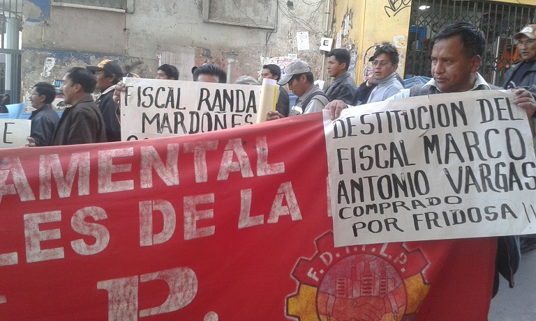 ¡Desprocesamiento inmediato a los trabajadores de Polar, Venado, Irupana y todos los trabajadores fabriles que lucharon por una vida digna! ¡Libertad y desprocesamiento inmediato a los mineros esclavizados por la patronal cooperativista! ¡Libertad a los campesinos pobres de Ayo Ayo condenados a treinta años de cárcel por el gobierno de Morales y al universitario Boris Arancibia, preso en la cárcel de San Sebastián-Cochabamba!