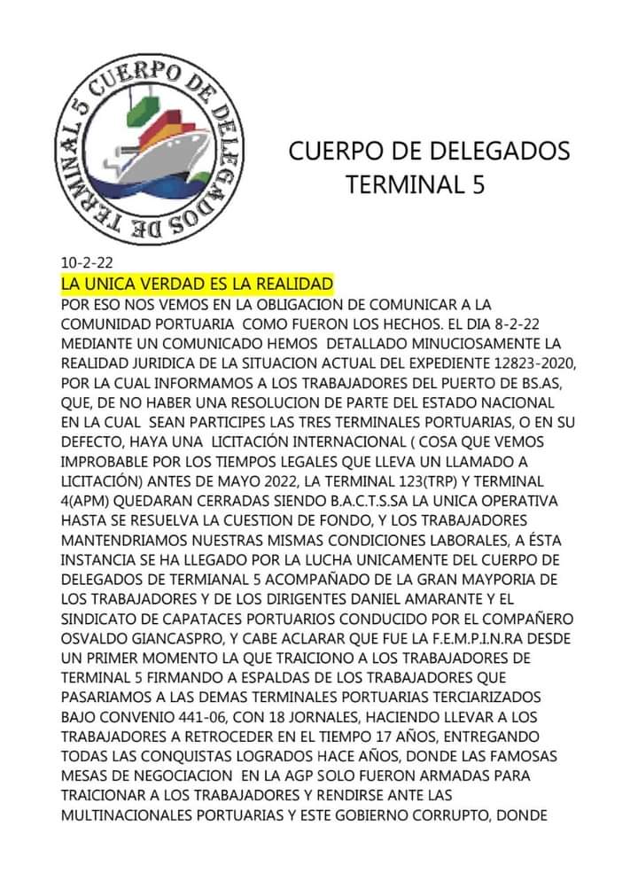 Por eso nos vemos en la obligación de comunicar a la comunidad portuaria como fueron los hechos. El día 8-2-22, mediante un comunicado, hemos detallado minuciosamente la realidad jurídica de la situación actual del expediente 12823-2020, por la cual informamos a los trabajadores del puerto de Bs. As., que de no haber una resolución de parte del estado nacional, en la cual sean partícipes las tres terminales portuarias, o en su defecto haya una licitación internacional (cosa que vemos improbable por los tiempos legales que lleva un llamado a licitación) antes de mayo 2022, la Terminal 123 (TRP) y Terminal 4 (APM) quedarán cerradas, siendo B.A.C.T.S.S.A. la única operativa hasta que se resuelva la cuestión de fondo y los trabajadores mantendríamos nuestras mismas condiciones laborales. A esta instancia se ha llegado por la lucha únicamente del cuerpo de Delegados de Terminal 5 acompañado de la gran mayoría de los trabajadores y de los dirigentes: Daniel Amarante y el sindicato de capataces conducido por el compañero Osvaldo Giancaspro. Cabe aclarar que fue la Fe.M.P.I.N.R.A. desde un primer momento la que traicionó a los trabajadores de Terminal 5 firmando a espaldas de los trabajadores que pasaríamos a las demás terminales portuarias tercerizados bajo convenio 441-06, con 18 jornales, haciendo llevar a los trabajadores a retroceder en el tiempo 17 años, entregando todas las conquistas logradas hace años, donde las famosas mesas de negociación en la AGP solo fueron armadas para traicionar a los trabajadores y rendirse ante las multinacionales portuarias y este gobierno corrupto, donde fueron los dirigentes, que cabe aclarar son empleados de los trabajadores. Es que con nuestro sudor abonamos la cuota sindical para pagar su salario y lo único que han hecho en este tiempo es esconderse cobardemente y traicionar a sus afiliados, que lo único que recibieron de sus representantes fueron frases como “ustedes tienen la panza muy llena, tienen que ceder” o “es lo máximo que se puede conseguir, es pasar a tercerizados, jornalizados o no hay más nada” o “manden un email al sindicato a firmar estas condiciones o quedan en la calle”.