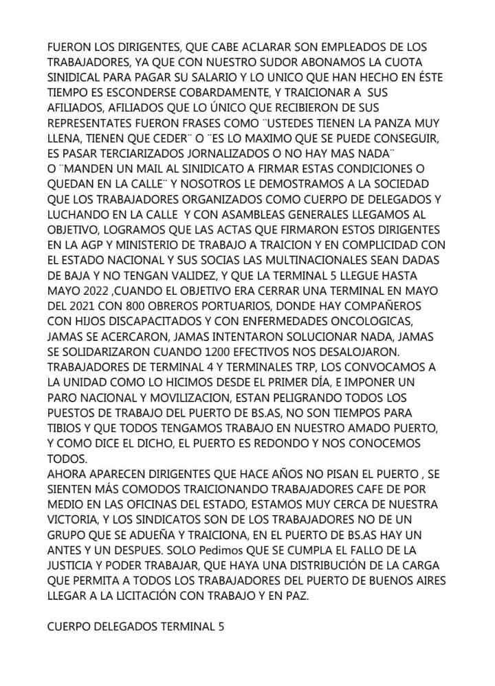 Nosotros le demostramos a la sociedad que los trabajadores organizados como cuerpo de delegados y luchando en la calle y con asambleas generales llegamos al objetivo, logramos que las actas que firmaron estos dirigentes en la AGP y Ministerio de Trabajo, a traición y en complicidad con el estado nacional y sus socias las multinacionales, sean dadas de baja y no tengas validez. Logramos que la Terminal 5 llegue hasta mayo del 2022, cuando el objetivo era cerrarla en mayo de 2021 con 800 obreros portuarios, donde hay compañeros con hijos discapacitados y con enfermedades oncológicas. Jamás se acercaron e intentaron solucionar nada, jamás se solidarizaron cuando 1200 efectivos nos desalojaron.