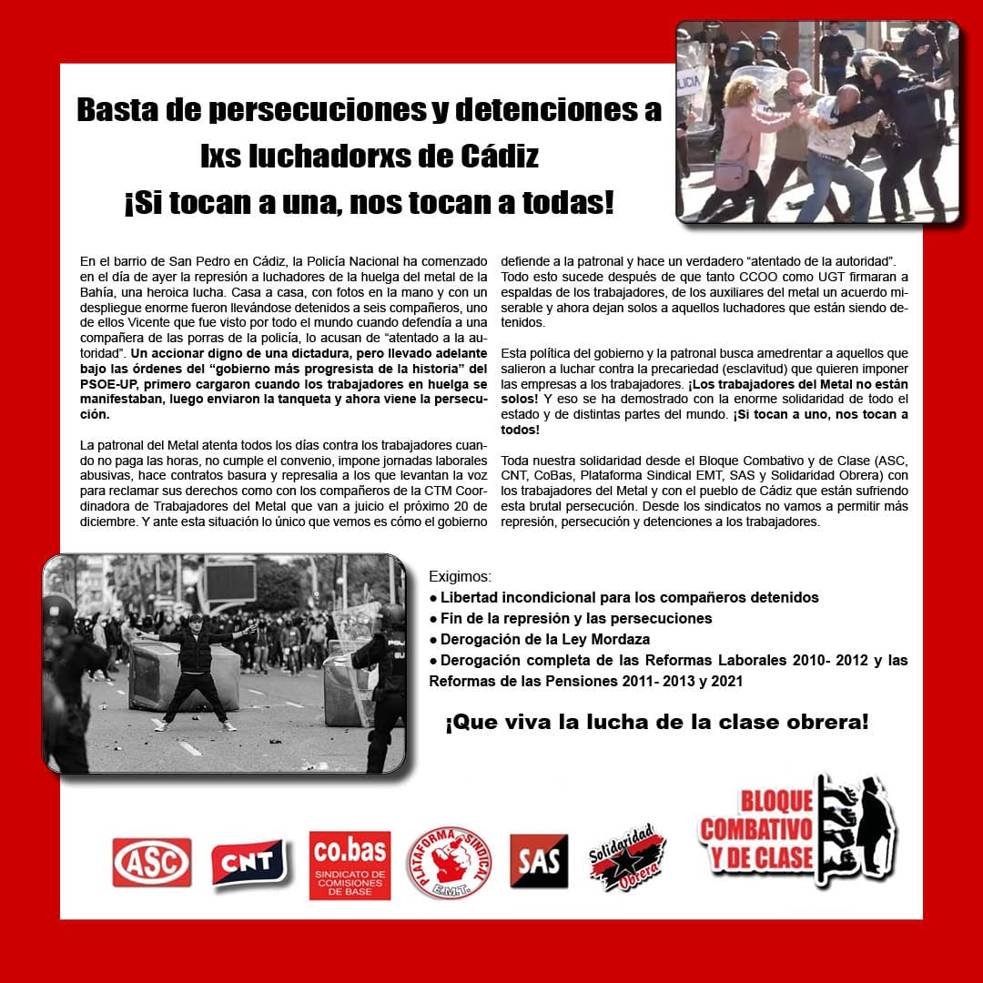 Toda nuestra solidaridad desde el Bloque Combativo y de Clase (ASC, CNT, CoBas, Plataforma Sindical EMT, SAS y Solidaridad Obrera) con los trabajadores del Metal y con el pueblo de Cádiz que están sufriendo esta brutal persecución. Desde los sindicatos no vamos a permitir más represión, persecución y detenciones a los trabajadores.