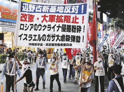 Manifestation sur l’avenue centrale de Naha, la capitale d’Okinawa. Sur la première ligne de la bannière : "Non à la nouvelle base à Henoko !"
