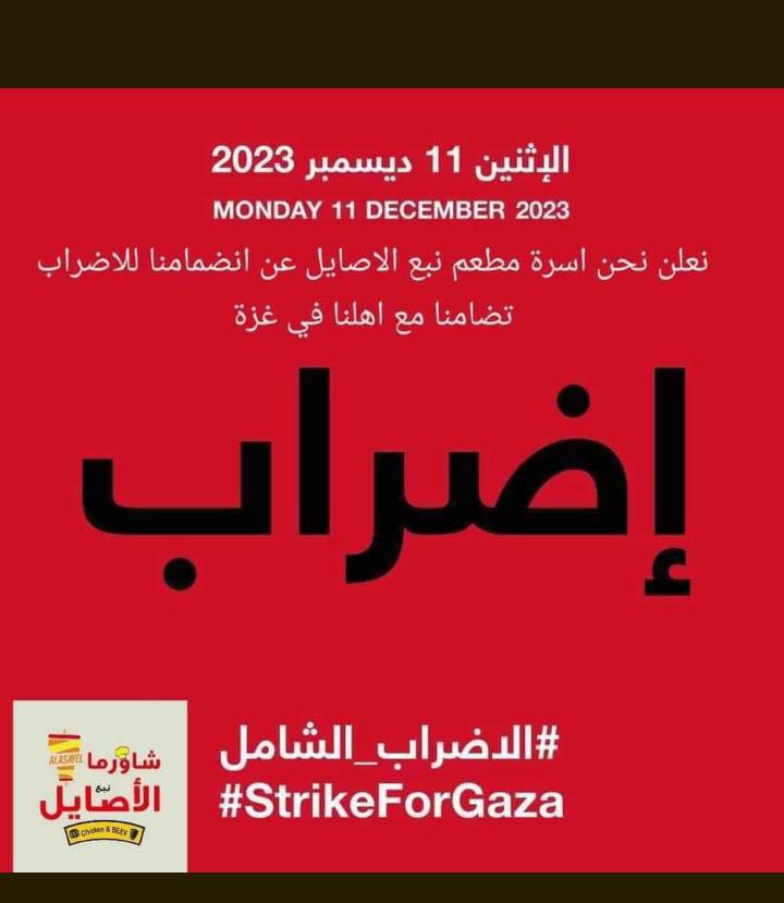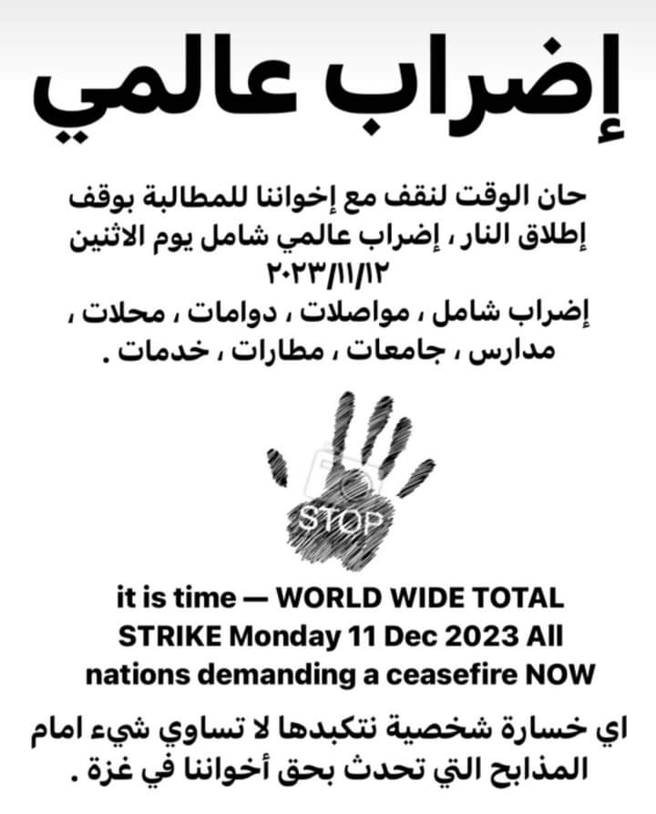 En línea con el llamado de los sindicatos de trabajadores de la UNRWA en los cinco países, y el anuncio de los Comités Populares Palestinos en el Líbano, en respuesta al llamado mundial en el Día Internacional de los Derechos Humanos a una huelga general e integral el lunes 11 de diciembre de 2023, para exigir el fin de la guerra y la agresión contra nuestro pueblo.