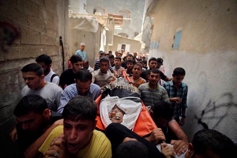 En el campo Shati, en el medio de su festejo, una explosión destrozó un coche, las fachadas de las casas cercanas y 8 niños murieron. Un joven palestino de 15 años explicaba que se escuchó “una explosión” en la calle. Cuando corrió al lugar, encontró “mujeres llorando, niños heridos y despojos diseminados”. Entre los muertos estaban sus primos Hamud, de once años, y Bara, de cinco. Ellos, junto a otros niños jugaban en la calle. Cerca del lugar donde estaban se veía el impacto irregular de un artefacto del que no quedaba resto a las seis de la tarde.