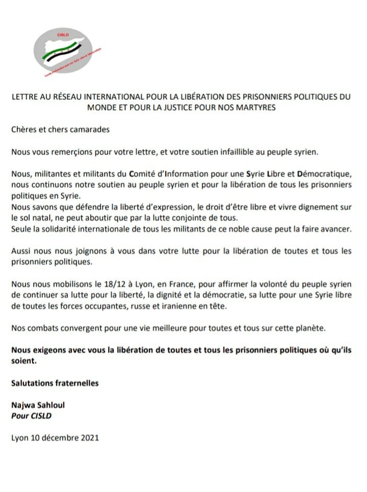 Nosotros, militantes del Comité de Información por una Siria Libre y Democrática, mantenemos nuestro apoyo al pueblo sirio y por la libertad de todos los presos políticos en Siria.