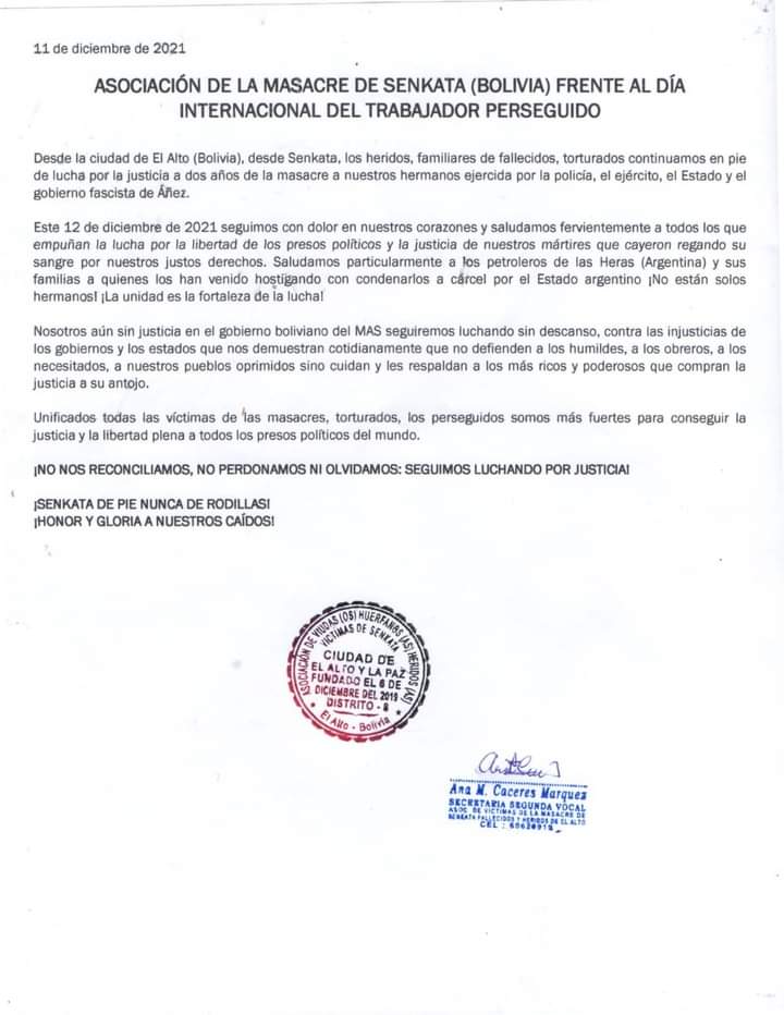 Este 12 de diciembre de 2021 seguimos con dolor en nuestros corazones y saludamos fervientemente a todos los que empuñan la lucha por la libertad de los presos políticos y la justicia de nuestros mártires que cayeron regando su sangre por nuestros justos derechos. Saludamos particularmente a los petroleros de las Heras (Argentina) y sus familias a quienes los han venido hostigando con condenarlos a cárcel por el Estado argentino ¡No están solos hermanos! ¡La unidad es la fortaleza de la lucha!